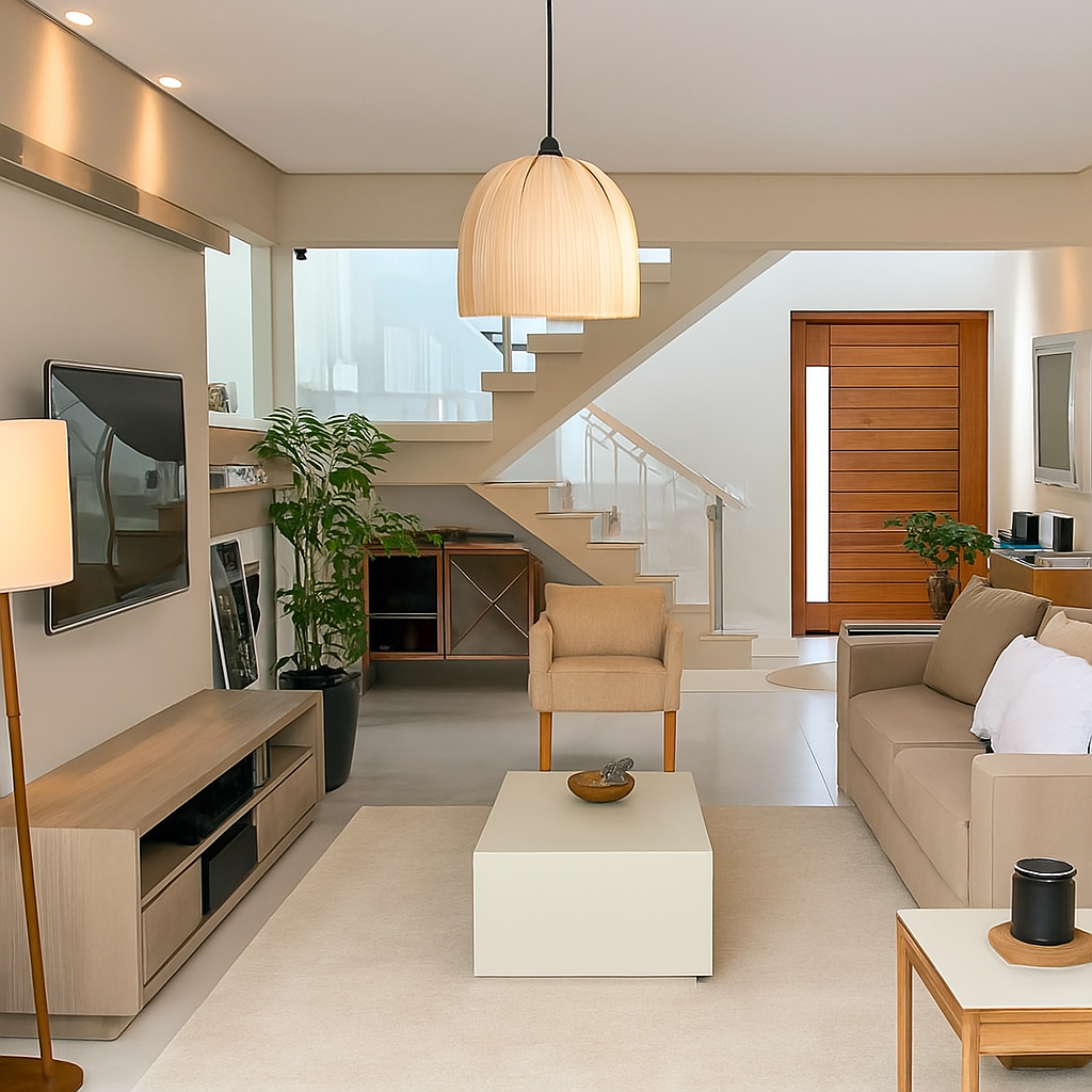 - Ambientes internos como sala de estar, quartos, corredores e banheiros